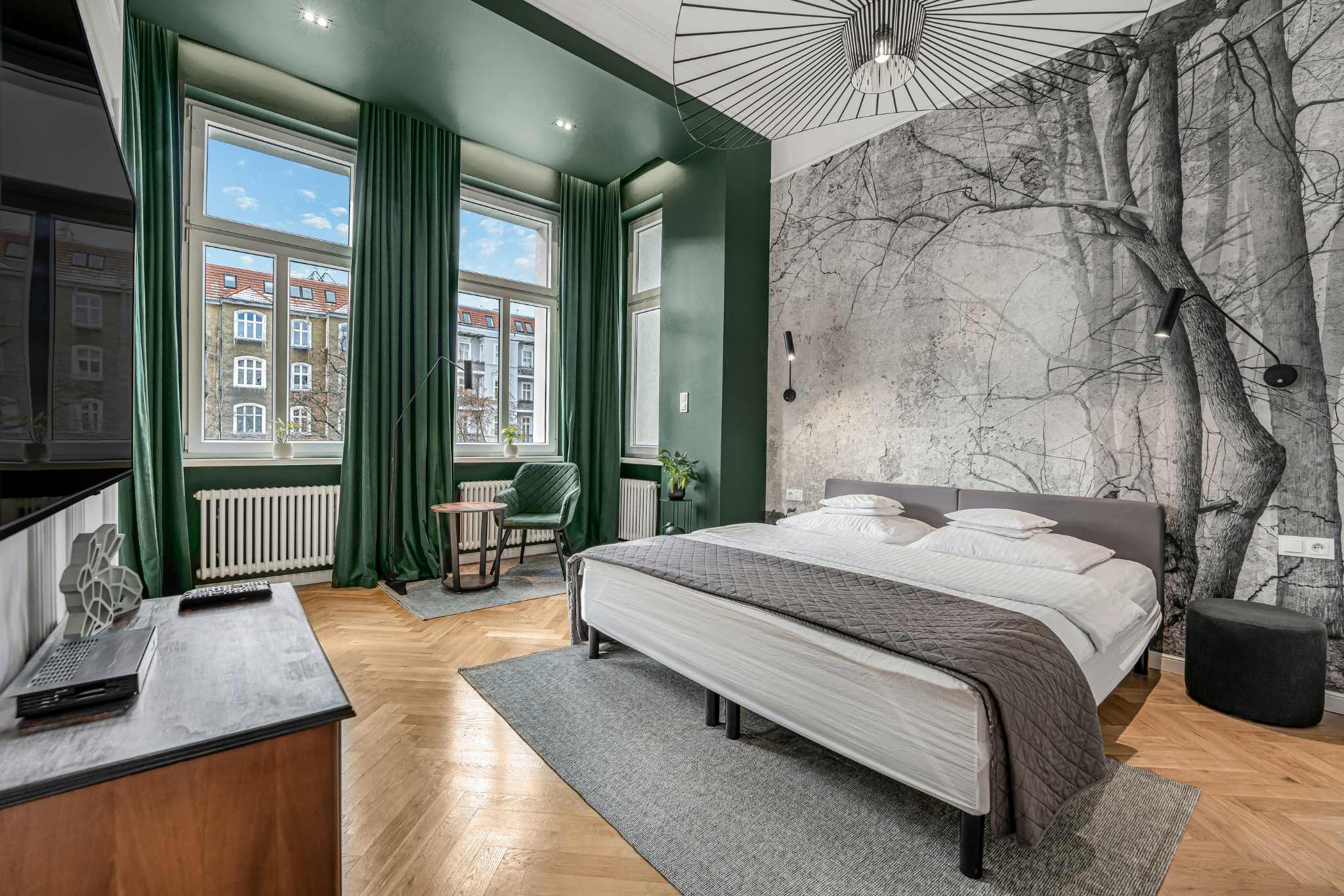 Stylowa przestrzeń z duszą — połączenie klasycznych detali z nowoczesnym wykończeniem. Jasne wnętrze, drewniany parkiet i głęboka zieleń nadają mieszkaniu wyjątkowego charakteru, który uchwyciliśmy w naszych kadrach.